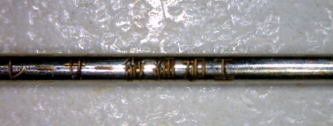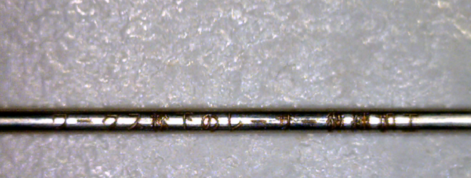 工業製品への加工と多少カテゴリーが重なりますが、金属へのレーザー微細加工を基本的得意としております。上のスライドは1mmの縫い針にレーザー加工をしたものです。