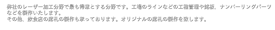 銘板プレートや部品のナンバーリングなどの加工も可能です。直接機械パーツへのレーザー加工も可能です。ワークの大きさ等は限界がございますので、仕様等はご相談ください。
